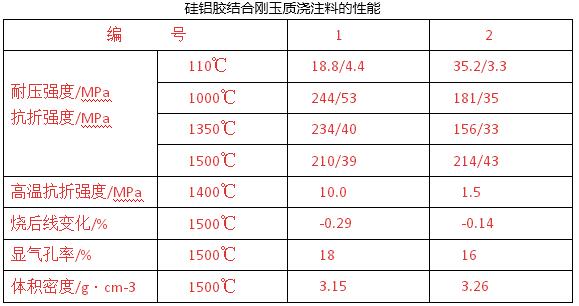 (下表)為硅鋁膠結(jié)合劑剛玉質(zhì)澆注料的性能。電熔剛玉骨料的顆粒組成(%):7~2.5mm 26%, 2.5~1mm 33%: 1~0.5mm 18%和 <0.5mm 23%。其用量為81.5%:α—AL2O3細(xì)粉的細(xì)度小于0.076mm ,其用量:編號(hào)1和編號(hào)2分別為6.0%和13.5%。固態(tài)硅鋁膠用量則分別為12.5%和5.0%。水用量為4.3%。
