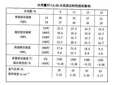 鋁酸鹽水泥品種不同,配制的耐火澆注料也不同。同一種水泥,也能配制成多品種的耐火澆注料。在耐火澆注料配合比和工藝條件相同時,其水用量對耐火澆注料性能影響規(guī)律是基本相同的,F(xiàn)以CA-50水泥高鋁質(zhì)耐火澆注料為例,其水用量對澆注料性能的影響是至關(guān)重要的。耐火骨料和粉料均為二級礬土熟料,骨料<15mm的統(tǒng)料70%,粉料和水泥各位15%。成型初凝后潮濕養(yǎng)護1d拆模,然后進行標(biāo)準(zhǔn)養(yǎng)護2d,檢驗各種性能。從表中看出,澆注料隨水用量的增加,各種性能普遍有較大的下降:常溫耐壓強度降低27%~35%,烘干耐壓強度降低到19.1MPa,燒后耐壓強度由1400℃將至1250℃,燒后線變化由—0.38%降為—0.96%,顯氣孔率由19%增值23%,體積密度由2.29g/cm³降至2.17g/cm³。這就是水,配置鋁酸鹽水泥耐火澆注料時,水用量(或水灰比)的選用十分重要。當(dāng)水用量多時,加熱后水分逸出,孔隙增多,結(jié)構(gòu)疏松,致使各種性能全面降低。因此,在保證其施工和易性的條件下,應(yīng)盡量減少拌和物的水用量。在不摻減水劑的前提下,鋁酸鹽水泥耐火澆注料的適宜水用量為10%~13%。