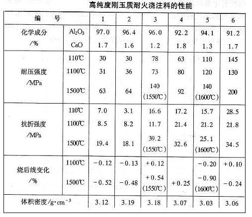 (表)高純度剛玉質(zhì)耐火澆注料性能