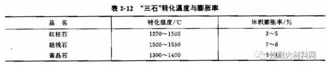 三石”包括硅線石、藍(lán)晶石、紅柱石,屬硅線石族礦物,為同質(zhì)異形體。其理論組成為Al2O363.l%、SiO236.9%、化學(xué)分子式為Al2O3.SiO2或Al2SiO3。因生成條件和結(jié)構(gòu)不同表現(xiàn)在陽離子配位上的差異,使理化性能既有共性又有差別,3種礦物原料均屬高鋁礦物,具有髙鋁礦物的性能,但其獨(dú)特性能又不為普通高鋁原料所具備^。“三石”被加熱至一定溫度不可逆的轉(zhuǎn)變?yōu)槟獊硎w(呈短柱狀、針狀的網(wǎng)絡(luò)結(jié)構(gòu),一般長(zhǎng)約3微米,最長(zhǎng)可達(dá)20微米),并析出SiO2,在加熱反應(yīng)過程中,伴隨莫來石化引起體積膨脹,其中以藍(lán)晶石膨脹率為大,紅柱石居中。轉(zhuǎn)化溫度與膨脹率見表2-12。