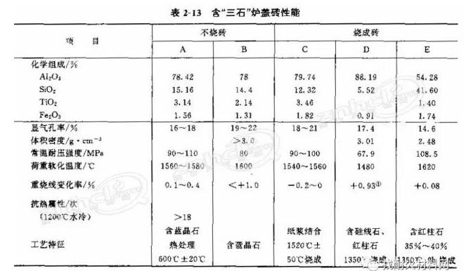 電爐蓋磚的使用實(shí)踐表明,磚的少許膨脹可以縮小磚縫,保持砌體的結(jié)構(gòu)完整性,在一定程度上可以防止片狀剝落。為此在鋁硅系中引入具膨脹特性的“三石”材料是有效途徑之 一。如含藍(lán)晶石的電爐蓋磚在撫鋼、舞鋼超高功率電爐上使用,壽命在150爐以上。