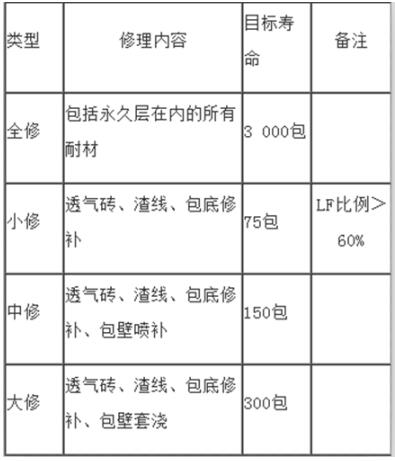 根據(jù)前面所述,鋼包耐火材料的理想配置應(yīng)為:包壁保溫層厚30 mm,永久層整體澆注料厚80~100 mm,工作層整體澆注料厚180~210 mm;渣線選擇低碳鎂碳磚,厚180~230 mm;包底采用整體澆注。根據(jù)鋼包大小選擇合適的整體爐襯厚度。借鑒國外先進(jìn)同行的管理經(jīng)驗(yàn),并參考我國透氣磚的實(shí)際使用情況,制定表1所示的修理模式,同時(shí)要繼續(xù)加強(qiáng)鋼包整體澆注料和應(yīng)用技術(shù)的研發(fā),以下兩點(diǎn)尤其重要: