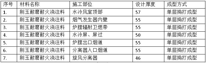 適用區(qū)域:主要用在爐膛密相區(qū)及汽冷式旋風(fēng)分離器等部位。此區(qū)域耐磨耐火材料設(shè)計(jì)為單層搗打結(jié)構(gòu),采用耐磨銷釘固定,其設(shè)計(jì)厚度較薄,一般在55mm左右,直接敷設(shè)在施工面上。耐磨耐火材料具體施工部位和耐磨層厚度見下表