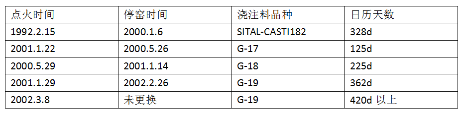 為使回轉(zhuǎn)窯窯襯達(dá)到1年的齡期,近年來選用了G-19剛玉碳化硅澆注料,與G-18剛玉鋼纖維澆注料進(jìn)行常識(shí)性對(duì)比,進(jìn)過一年的使用對(duì)比G-19的性能優(yōu)于G-18。