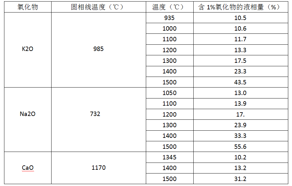 剛玉澆注料一般都為低水泥型,主要成分為Al2O3和SiO2。其中Al2O3含量大于90%,SiO2含量大約在3%~4%左右,還含有少量的CaO等。堿金屬是以游離的K2O、Na2O以及K2SO4、Na2SO4的形式侵入耐火材料,其影響程度使十分嚴(yán)重的。