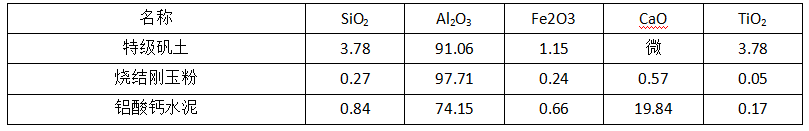 以特級礬土熟料和燒結(jié)剛玉為骨料和摻合料,鋁酸鈣水泥為結(jié)合劑,外加少量減水劑和一定比例的耐熱鋼纖維。主要原料的理化性能見表1。