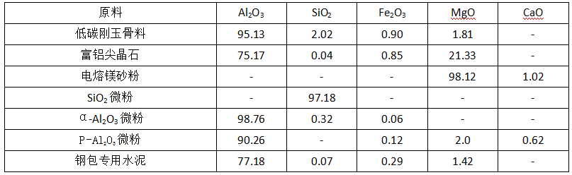 試驗(yàn)采用低碳剛玉、鎂砂和富鋁尖晶石為主要原料,因材料要求具有優(yōu)良的抗渣侵蝕性、抗渣滲透性和抗剝落性,所以采用超微粉和鋼包專用水泥結(jié)合。為滿足所需材料的各種理化性能指標(biāo),保證其使用效果,確定原料最佳的臨界粒度為8mm。試驗(yàn)用各種原料及化學(xué)組成見表1,試驗(yàn)用不同鋼廠精煉渣化學(xué)成分見表2,試樣的配料組成見表3。