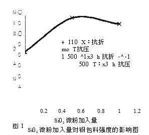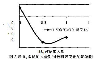 早期一般認(rèn)為Si02微粉加入到澆注料中,能通過高溫在其表面形成一個致密層,達(dá)到增加抗渣的目的。而后有研究則認(rèn)為Si02含量為0〜2.0%的澆注料,發(fā)現(xiàn)Si02微粉的加入不能抑制渣侵蝕,但增加了結(jié)構(gòu)的耐剝落性。Si02微粉加入量>0.5%導(dǎo)致重?zé)變化是負(fù)值。還有研究發(fā)現(xiàn)Si02微粉加入量為0.5%的澆注料,其高溫抗折強(qiáng)度急劇下降,而荷重軟化點(diǎn)卻基本上穩(wěn)定;高溫抗折強(qiáng)度從沒加硅微粉的14 MPa減小到加入量為0.5%時的2MPa。在荷重軟化點(diǎn)的試驗(yàn)中,在0.2MPa荷載下加熱到1660℃的熱膨脹對于沒加硅微粉的澆注料是正值,而對于加入0.5%硅微粉的澆注料則是負(fù)值。而且Al203-尖晶石澆注料的高溫抗折強(qiáng)度隨著溫度從1300℃上升到1500℃而不斷增加,而且比高鋁澆注料的還要高得多。但在我們所研究的剛玉-尖晶石體系的鋼包料中,其Si02微粉的加入量在此基礎(chǔ)上則要更加嚴(yán)格控制,否則其烘后、燒后性能指標(biāo)會變化很大。Si02微粉對剛玉-尖晶石鋼包料物理性能的影響見圖1、圖2。
