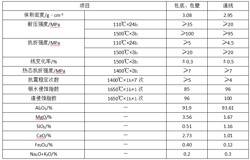 新研制的剛玉-尖晶石澆注料在鋼包上使用,結(jié)構(gòu)穩(wěn)定,剝落深度小,剝落速度慢,磨損速度也比傳統(tǒng)的澆注料減小30%之多。本次研發(fā)新產(chǎn)品的主要性能指標(biāo)見表7。