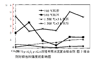 先了盡可能的減少鋼水中的雜質(zhì)含量,提高鋼水的潔凈度,我們對結(jié)合劑的選擇尤為慎重,通過CA-80、CA-70、þ-Al203þ-Al203改性、鋼包專用水泥、復(fù)合結(jié)合劑的對比,選擇性能最好,最經(jīng)濟(jì)、實(shí)用的結(jié)合劑。結(jié)合劑對剛玉-尖晶石鋼包料物理性能的影響見圖3、圖4。