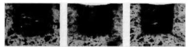 對于新研發(fā)的剛玉-尖晶石鋼包料,我們采用靜態(tài)坩堝法于1600℃x3h進(jìn)行抗渣侵蝕試驗(yàn),分別用武鋼精煉渣、成鋼精煉渣和浦項(xiàng)精煉渣,樣塊切面抗渣侵蝕結(jié)果如圖5所示。