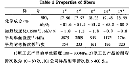 生產(chǎn)線改造后,我們分別制備了含72%、80%和95% Al2O3的膠體,經(jīng)試產(chǎn)進(jìn)一步證實(shí)了試驗(yàn)室所選擇的工藝條件是合適的。本生產(chǎn)線可以同時(shí)生產(chǎn)含72%和80% Al2O3的多晶纖維,而不能生產(chǎn)含95% A1203的纖維。