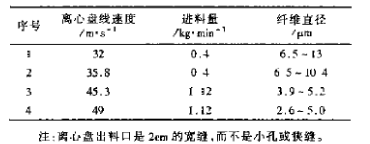 實(shí)驗(yàn)結(jié)果說明,只要甩絲盤具有足夠大的合適線速度,即使寬縫式出膠口亦能使纖維直徑變細(xì)。同時(shí),提高線速度還可以提高產(chǎn)量。