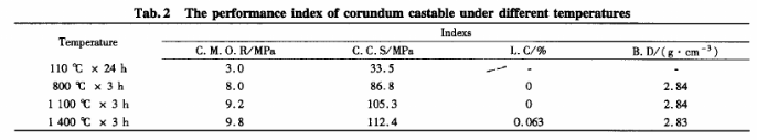 按一定的質量比稱取各相應的原料放入攪拌鍋中均勻,并分別添加適量的復合添加劑和結合劑。經試驗測定該材料的流動速度為107.8%(跳桌法),能較好的滿足材料的施工性能要求。同時通過對材料現(xiàn)場澆注過程的分析,我們采用相應的模擬試驗,把攪拌好的料直接放入一定溫度的40mm×40mm×160mm模具內振動成型,把成型好的試樣及其模具一起放入烘箱進行60℃×3h的烘烤后脫模,此階段相當于材料的澆注施工中,因為不斷鋪料時,材料中含自由水分的揮發(fā),有效的降低了材料施工環(huán)境的溫度,而材料在施工完成后,水分逐漸排出,溫度開始升高,因此我們烘烤2個小時直接進行110℃烘烤,經過約2h烘烤后,材料內部自由水分基本完全排出(通過對試樣在110℃經2h、4h、6h烘烤后,測得試樣的質量在2h后變化不大,4h基本無變化),其后就對試樣分別進行815、1100和1400℃保溫3h的熱處理,相當于高爐修補后的復風。其理化指標見表2。