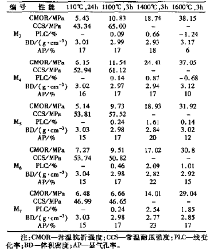 采用相同的骨料,改變細粉組成進行試驗。鎂砂細粉含量(試樣編號)分別為3a(M3)、4a(M4)、5a(M5)、6a(M6)、7a(M7),白剛玉細粉作相應的調(diào)整。骨料與基質(zhì)的比例為7:3。攪拌好后,制成40mm×40mm×160mm的試樣,室溫下養(yǎng)護24h后脫模,測定110℃,24h、1100℃,3h、1400℃,3h和1600℃,3h熱處理后試樣體積密度、顯氣孔率、線變化率、常溫耐壓強度及常溫抗折強度。