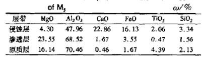 選取M5抗渣試驗后的樣塊進行微觀分析。圖2為M5抗渣各層帶的SEM照片。對侵蝕層發(fā)育完整的針狀晶體進行微區(qū)分析,其化學組成(質(zhì)量分數(shù),%)為:Al2O3 74.92,CaO 21.18,F(xiàn)eO 3.90,屬CaO-Al2O3系化合物;在侵蝕層與滲透層交界面有一層厚度約0.5mm的致密層,其各組分的質(zhì)量分數(shù)(%)為:MgO 1.21、Al2O3 80.60、CaO 8.91、SiO2 1.34、FeO 5.48,其A/C≈10(CA6中A/C=10.9),應該是CA6;在滲透層里,主晶相為尖晶石(約占80%),還有少量的CA6晶體相互交錯,結(jié)構(gòu)比較致密;在原質(zhì)層里,主晶相為尖晶石,粒徑相對較小,晶粒互相連接,但整體結(jié)構(gòu)較疏松。由圖1可知,隨鎂砂細粉加入量增加,試樣的抗渣性隨之下降,從鎂砂細粉加入量為5a開始,渣滲透明顯增加。這主要是由于Fe2O3固溶于鎂砂中,使得熱面與澆注料內(nèi)部存在一定的Fe2O3濃度差,更促進了渣的滲透;另外,從1600℃,3h燒后顯氣孔率的結(jié)果可知,抗渣性隨鎂砂細粉含量增加而降低的又一原因是由于在燒成后顯氣孔率的增加。表5示出了侵蝕層、滲透層及原質(zhì)層的EDAX面分析結(jié)果,可見渣中的CaO、FeO向材料內(nèi)部侵入,CaO與Al2O3反應生成針狀和條柱狀的CA6,使?jié)B透層的結(jié)構(gòu)致密,F(xiàn)eO被尖晶石大量吸收而形成(Mg·Fe)O·Al2O3復合尖晶石,從而抑制了FeO的進一步滲透。