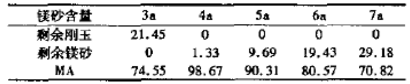 表4為試樣的基質(zhì)中鎂砂細粉與剛玉細粉完全反應生成理論尖晶石基質(zhì)的成分?梢姡V砂細粉含量為3a、4a時,因基質(zhì)中鎂砂細粉與剛玉細粉在1400℃左右已經(jīng)反應完全,故在更高溫度下僅為燒結(jié)收縮起作用,在1600℃燒后呈現(xiàn)收縮;而M5、M6、M7在以后的溫度下剩余的鎂砂細粉仍然與骨料中的剛玉發(fā)生反應,繼續(xù)產(chǎn)生膨脹,抵消了部分燒結(jié)收縮而呈現(xiàn)處或多或少的膨脹,隨鎂砂細粉含量增加,膨脹顯著增加。
