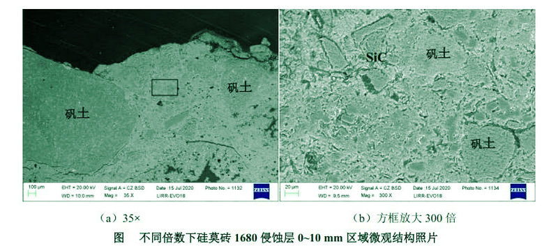 下圖為堿侵蝕后硅莫磚1680侵蝕層0~10mm 區(qū)域不同倍數(shù)下的SEM 照片。從圖(a)觀察發(fā)現(xiàn):接觸K2CO3的坩堝底部表層結(jié)構(gòu)致密,大顆粒邊緣部分區(qū)域出現(xiàn)裂紋。從圖(b)觀察看出:基質(zhì)中礬土顆粒邊緣被侵蝕明顯,碳化硅無明顯變化。
