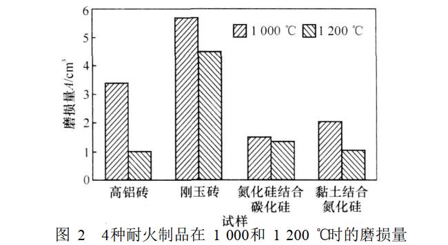 4種耐火制品在1000和1200℃時磨損量的比較。從圖2中可以看出:
