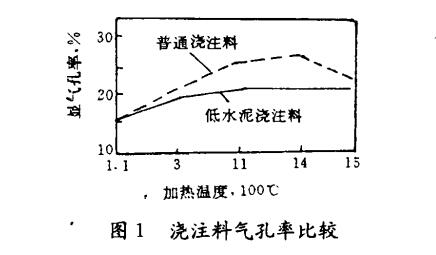 低溫時低水泥澆注料與普通澆注料的總孔隙相近。高溫加熱時低水泥澆注料變化不大,普通水泥澆注料總孔隙增加4%。如下圖1