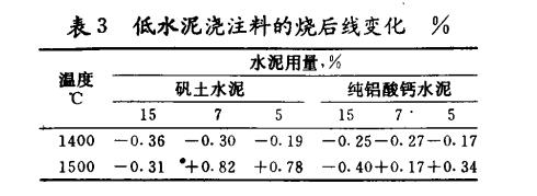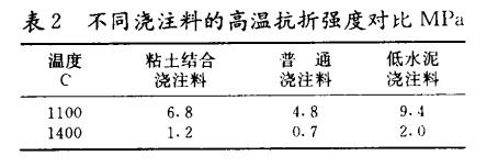圖2為低水泥澆注料與普通澆注料、粘土澆注料強度變化的比較?梢姡退酀沧⒘铣貜姸容^高,而中溫強度也不降低。表2表明了不同澆注料高溫?zé)釕B(tài)抗折強度的對比,可見低水泥澆注料的高溫抗折強度為普通澆注料的2~3倍,比粘土的也提高了許多。著說明低水泥澆注料兼有普通澆注料和粘土澆注料兩者的優(yōu)點,它在各種溫度下都有高強度的特點,這對于溫度高,出鋼頻繁,鋼錠和鉗吊經(jīng)常碰撞的場合,無疑是有好處的。