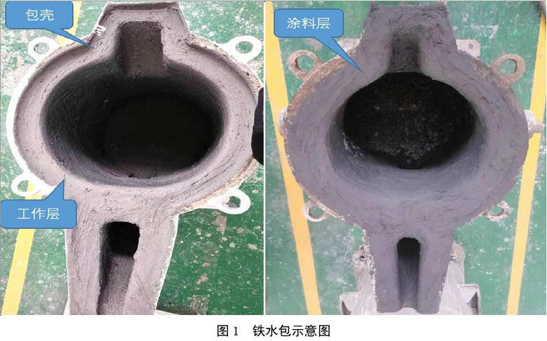 鐵水包由包殼和包襯組成。包殼由鋼板鉚焊,包襯由工作層+涂料層組成。工作層采用耐高溫的耐火澆注料澆筑成型,工作襯厚度為100~150mm,涂料層厚度為10~15mm,如圖1所示。