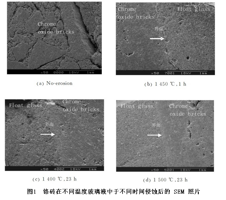 氧化鉻磚以下簡稱為鉻磚最早在有色冶金爐、煤氣渣化爐上使用,具有優(yōu)良的抗爐外煉鋼渣、有色冶煉渣、煤氣化爐渣和各種玻璃液的侵蝕能力。這種耐火材料在玻璃熔窯上得到廣泛應用,但僅局限于深色瓶罐玻璃熔窯或無堿玻璃纖維熔窯,且主要用在玻璃熔窯的高溫部位,如上層池壁、小爐口、流液洞、加料口等處。由于它能顯著延長窯齡,因此引起了玻璃界的普遍關(guān)注.但是,由于鉻磚的價格比熔鑄鋯剛玉耐火材料的價格高出6倍多,所以,目前鉻磚的應用范圍還不廣泛,特別是在平板玻璃熔窯上的應用。本文主要講無色透明浮法玻璃液對鉻磚的侵蝕過程,重點討論了侵蝕速率與侵蝕溫度、侵蝕時間的相互關(guān)系。