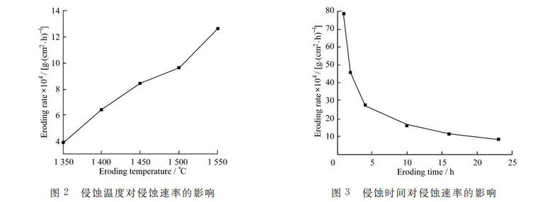 靜態(tài)條件下,侵蝕溫度是影響鉻磚耐玻璃液侵蝕性的主要因素.隨著侵蝕溫度升高,鉻磚受玻 璃液侵蝕的速率增加,其1500 ℃時所受侵蝕速率比1350 ℃時大一個數(shù)量級.鉻磚受玻璃液侵蝕 的速率隨著侵蝕時間延長而迅速減小,并趨于穩(wěn)定。