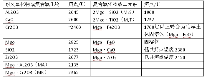 從表1可以看出,在所有常用的耐火氧化物中MgO的熔點最高,而且MgO可以與許多氧化物或熔渣中成分形成高熔點的化合物貨固溶體,MgO與一些氧化物形成的二元系的低共熔點溫度也很高。因此,含MgO的鎂質(zhì)耐火材料是煉鋼體系中最合適的耐火材料。